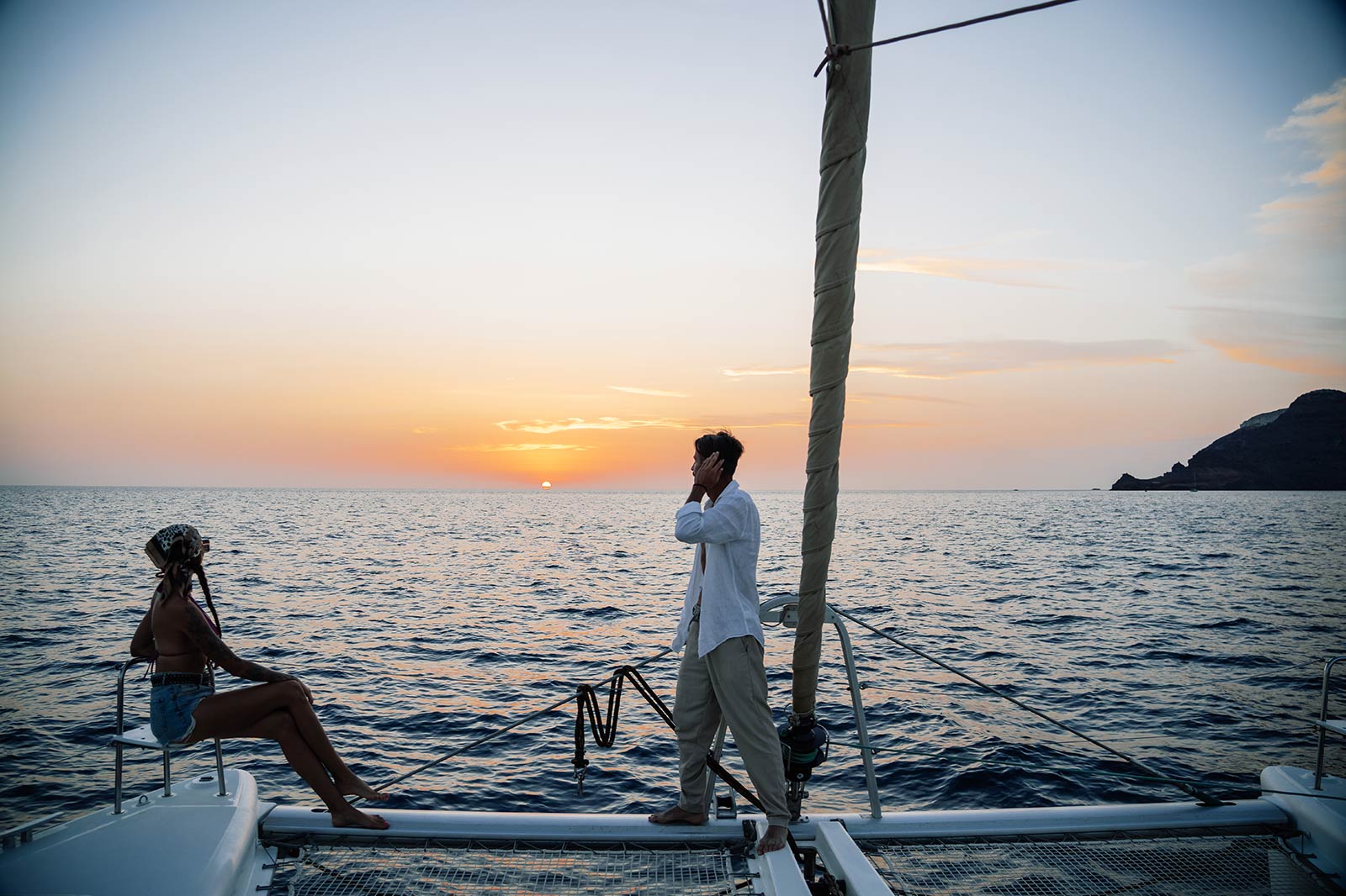 Découvrez la fascinante île de Santorin, en Grèce, à bord de notre croisière exclusive au coucher du soleil. Plongez dans le charme captivant de la mer Égée en embarquant pour un voyage remarquable à bord de notre catamaran de luxe.