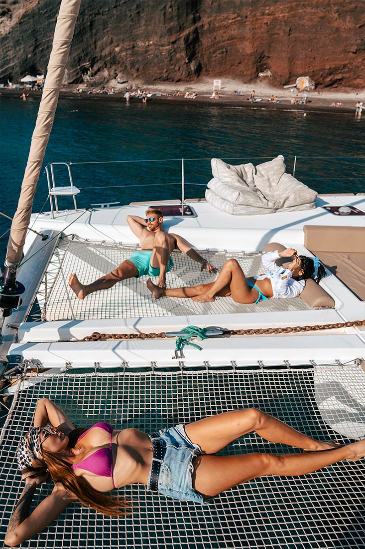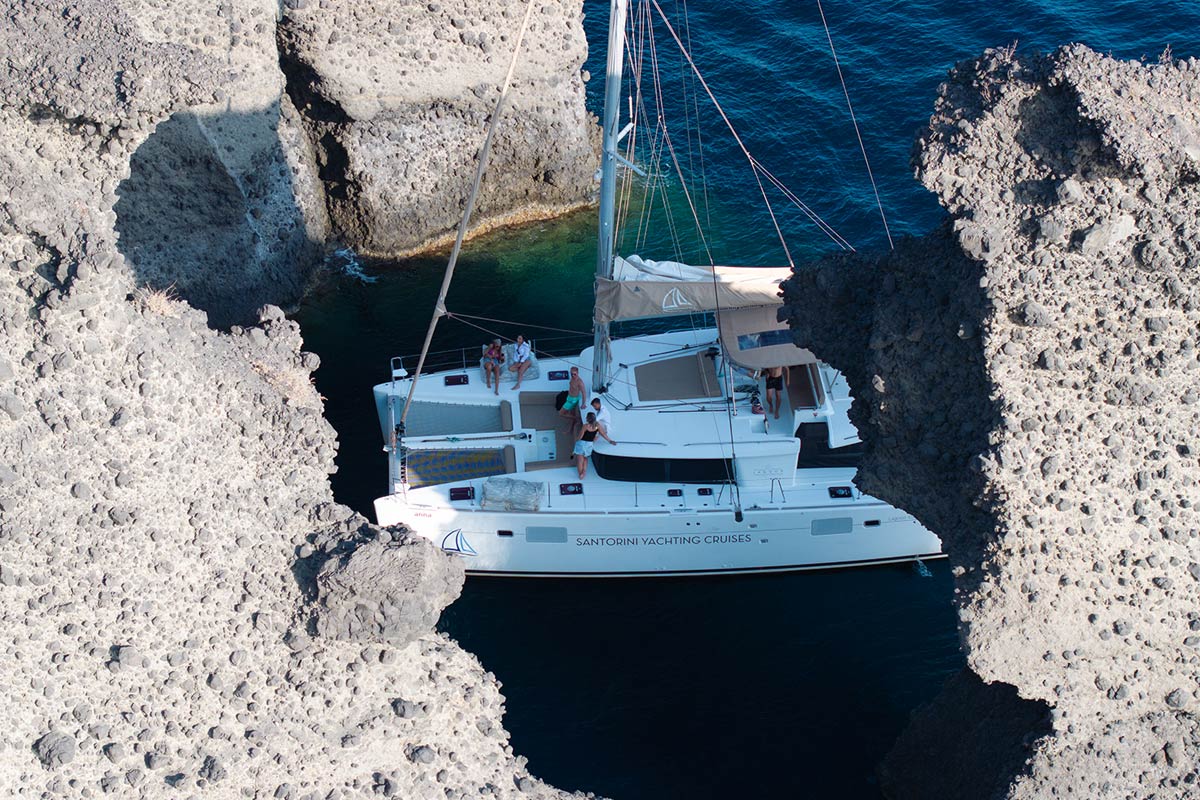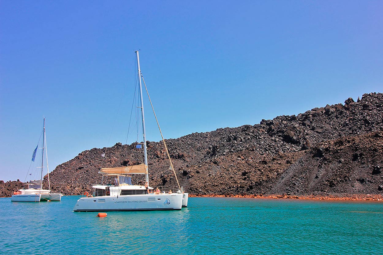 Notre croisière en catamaran d’une journée à Santorin part du port pittoresque de Vlychada et vous emmène à la découverte de la beauté de la plage rouge, de la plage blanche, des rochers indiens et du phare historique vénitien d’Akrotiri.